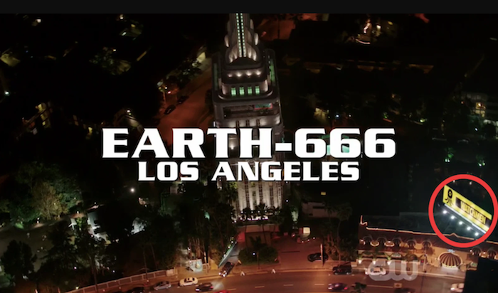 En la tercera parte de Crisis en Tierras Infinitas, cuando la trama se dirige a la Tierra-666, donde a los espectadores les esperaba un sorprendente cameo, la cámara muestra un rascacielos y a su derecha se puede ver un gran cartel.