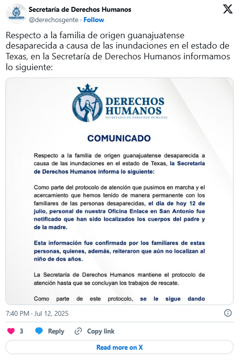 Respecto a la familia de origen guanajuatense desaparecida a causa de las inundaciones en el estado de Texas, en la Secretaría de Derechos Humanos informamos lo siguiente: pic.twitter.com/l7WSACdg8F