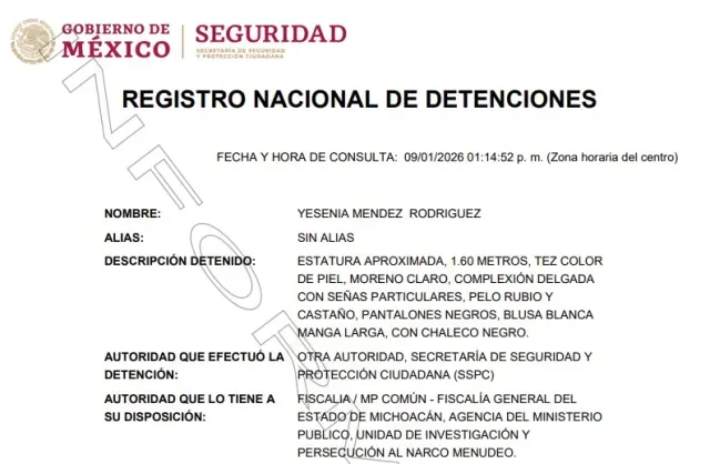 Elementos de la Secretaría de Seguridad y Protección Ciudadana detuvieron a Yesenia “N”, secretaria particular de la presidenta municipal de Uruapan, Grecia Quiroz, por delitos relacionados con el narcomenudeo.